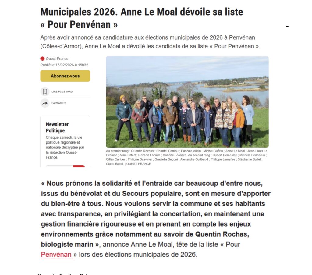 Je suis particulièrement fier de pouvoir mettre mes connaissances et mon expérience au service de la commune de Penvénan à travers la liste « Pour Penvénan ». Contribuer activement à la réflexion et aux actions locales est, pour moi, une manière concrète de transformer les idées en projets utiles et durables pour notre territoire.”